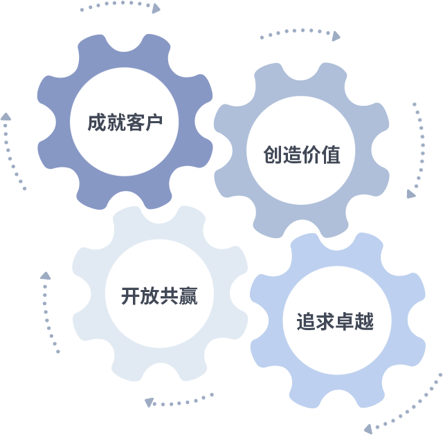 成就客户是一切决策的出发点,创造价值是衡量所有工作的标准,追求卓越是今年会做事做人的态度,开放共赢是今年会的格局也是最终的结果。价值观的齿轮环环相扣,推动着组织里的每个人不断向前。
